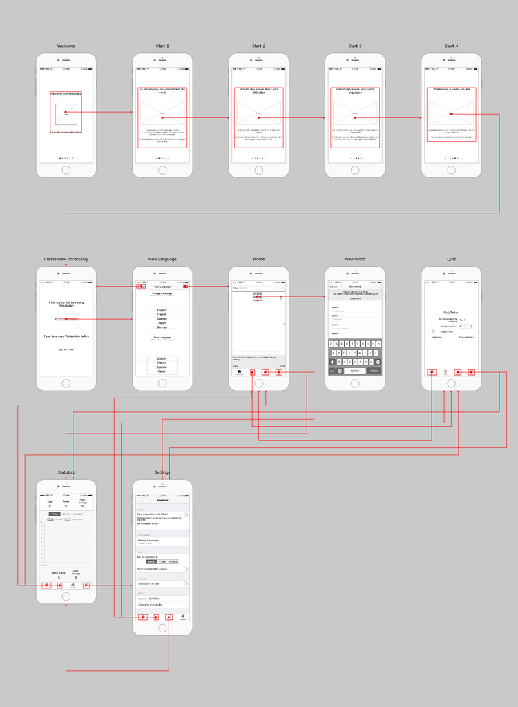 这个原型的主要页面有:欢迎页面、启动页、主页、语言选择页面、设置页面等。