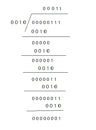 我们来看这样一个例子:在8位寄存器中存储了00000111,4位寄存器中存储了0010,计算00000111/0010。