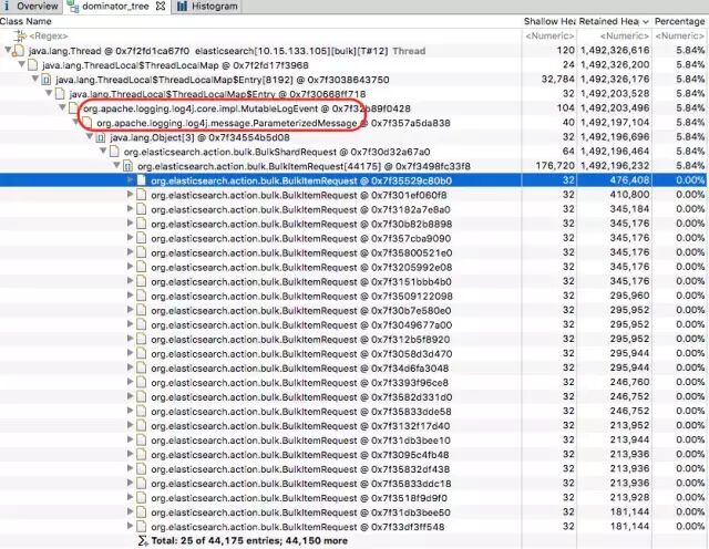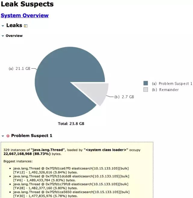 通过Leak Suspects,一眼看到这20多GB内存主要是被一堆bulk线程实例占用了,每个实例则占用了接近1.5GB的内存。