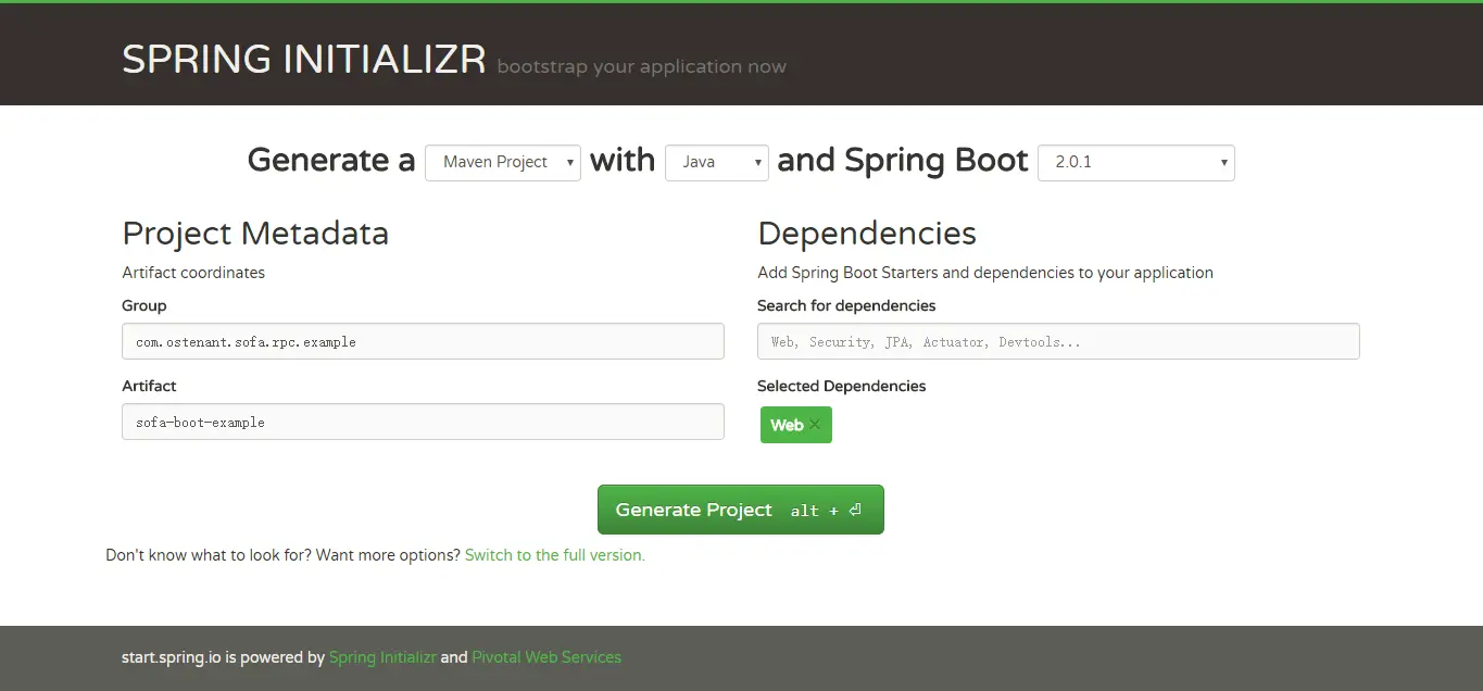 SOFABoot 是直接构建在 Spring Boot 之上,因此可以使用 Spring Boot 的工程生成工具来生成。添加一个 Web 的依赖,以便最后在浏览器中查看效果。