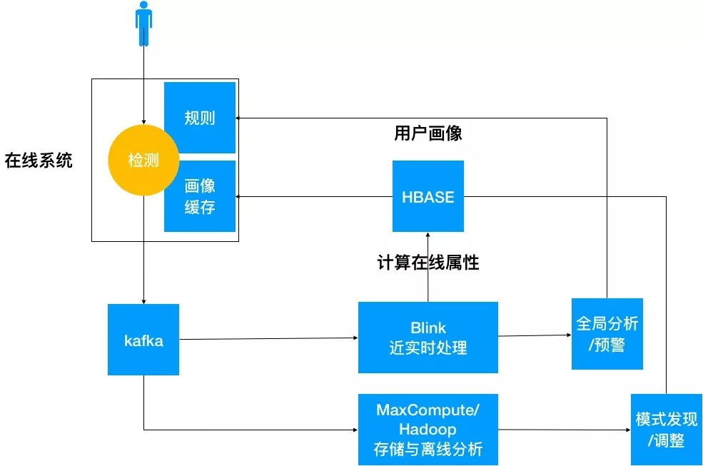 由于行动者可能会根据系统的结果进行调整,所以规则也会更新,流计算和离线的处理用来研究规则是否需要更新以及规则如何更新。