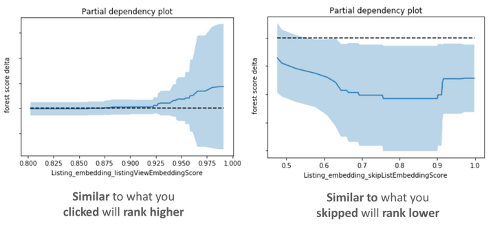 所以部分依赖图的观察结果证实,特征行为符合我们之前预期的模型将学习的内容。除此之外,当新的嵌套特征在搜索排序模型特征中重要性排序很靠前的时候,我们的离线测试结果显示各项性能指标都有所改进。这些数据让我们做出了进行在线实验的决定,之后该实验取得了成功,我们在 2017 年夏季上线了将嵌套特征用于实时个性化生成推荐的功能。