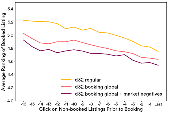 - d32 全球训练 + 市场负面训练,被预订房源作为全局上下文,且加入了中央房源的目的地中抽样选择的随机负例样本作为负值(见上述目标优化公式)