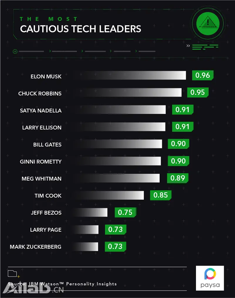 在谨慎方面,其余排名如下:微软CEO萨蒂亚·纳德拉排名第三,比尔盖茨排名第五,看来微软的领导层都是谨慎派。苹果的库克排名第八,谷歌母公司拉里·佩奇和Facebook小扎排名后两位垫底。