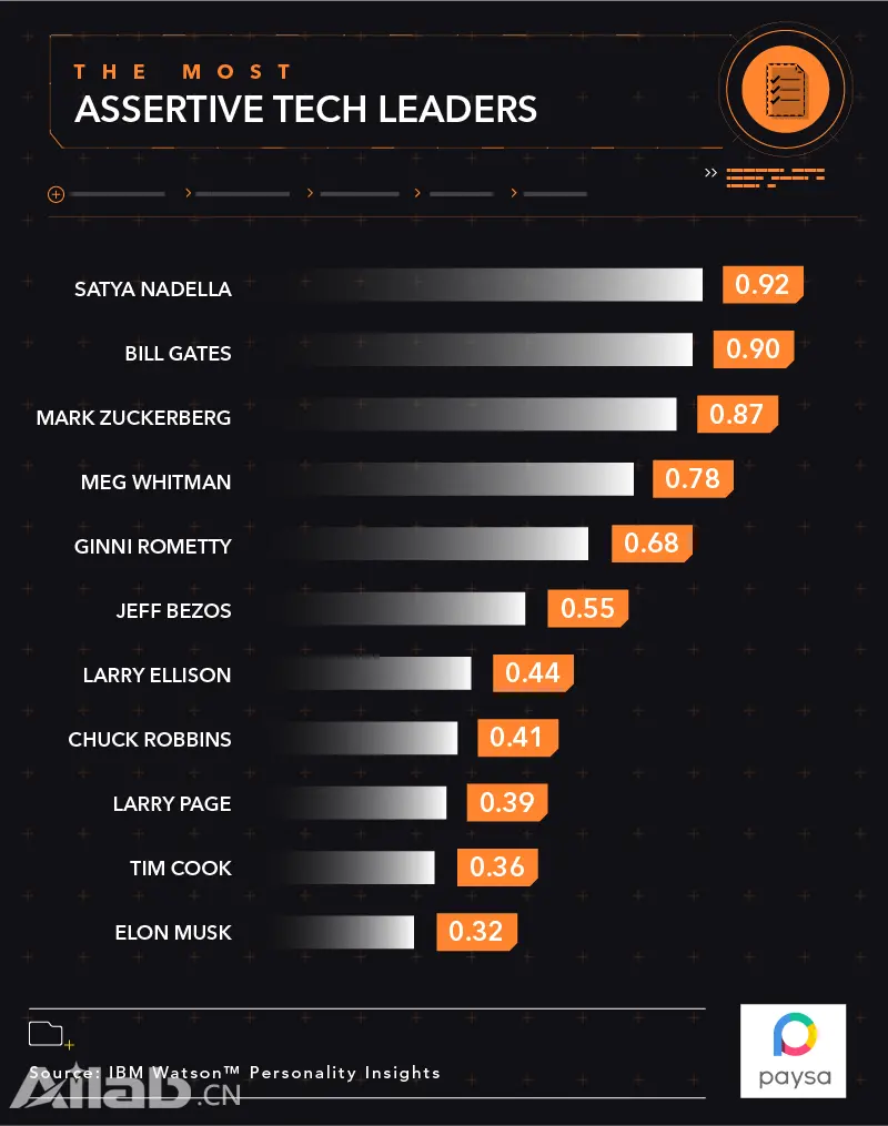 而在与谨慎有些对立的决断力这一特质排名中,马斯克垫底。而微软CEO萨蒂亚·纳德拉排名第一,比尔盖茨排名第二。看来微软的CEO们可以快速谨慎而坚定地下决策。