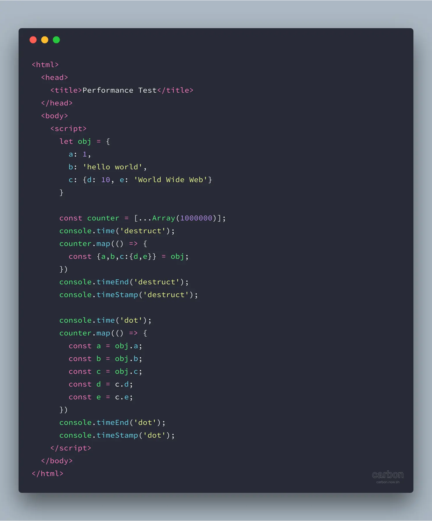 可以看到,对象解构在代码的数量上减少了许多,那么问题来了,从前我们在进行点操作访问对象属性的时候,处于性能考虑,会将频繁访问的属性先用一个变量保存起来,特别是深度越深的属性,点操作需要的时间也会愈多,因此缓存属性是一个比较好的方法;那么现在与对象解构相比,究竟那种操作会更消耗时间呢?