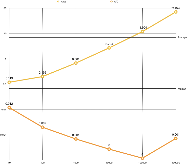 我分别测试了循环10次,100次,1000次,10000次,1000000次,10000000次的对象访问,可以发现随着循环次数增加,消耗时间是指数增长的,然后我又计算7种循环模式下,每次循环消耗的时间,可以看到,随着循环的数量增加,每次消耗的时间反而在减少,但是,在最后的10e7次的循环中,却出现了一个反弹。再来看下点操作的时间消耗