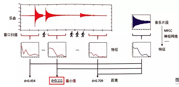 通过窗口扫描(把音乐分割成一小段一小段的),然后提取这一段的声学特征,例如梅尔频率倒谱系数(Mel-FrequencyCepstralCoefficients,MFCCs),就得到一个特征向量。对数据库的歌和用户录音的歌做同样的操作得到特征向量,然后两两之间计算相似度(两个向量的距离可以用余弦公式算夹角大小或者两点间距离公式来算)。