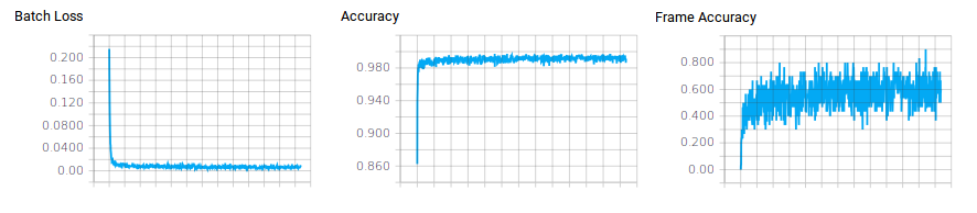 通过TensorFlow在980 Ti GPU上训练了几天之后,该模型在测试集上的准确率达到了99.200%。(该分数是由将88个输出中的每一个计为0或1,并测量与真值相匹配的所有输出的占比。需要注意的是,由于每个训练示例的数据集平均有3个音符和85个非音符。按照这种算分方法即使从未检测到任何音符,使用此测量的准确率也为96.6%。)