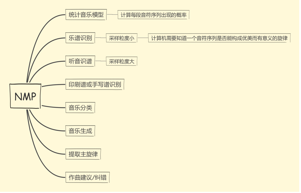 因为哔谱哔谱已经搭建了一个开源曲谱库的关系,所以我们就想是不是能够以曲谱库为依托,建立一个统计音乐模型,用于自然音乐处理(Natural Music Processing)方面的研究 。下图是我们通过整理、类比得到的NMP可能具有的相关前景。