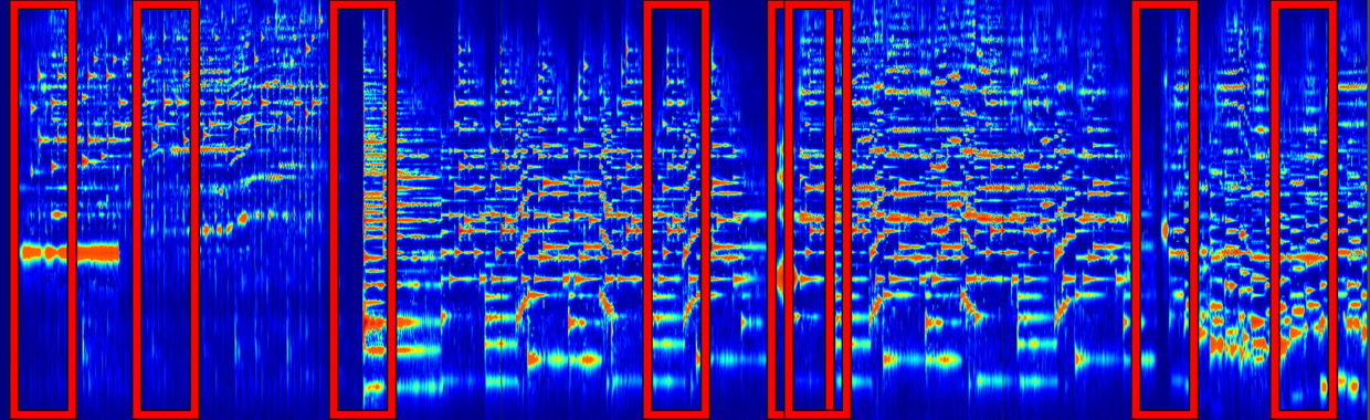音符起始点检测提供了CNN评估的样本,这些以红色矩形为界的区域就是CNN的输入。