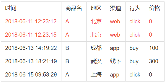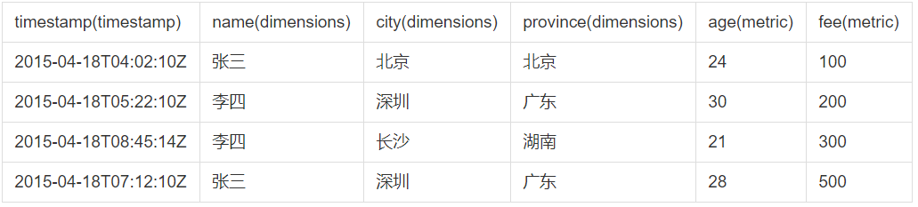 前面重点说了dimensions,我们再来看下metrics。在上面的例子中我们只定义count和针对price的doubleSum,那么这些指标就已经固定了后期的分析需求。我们看到上面table中的一二行标红部分,所有dim取值完全相同,queryGranularity为一分钟。那么在这2018-06-11 12:23:00这个点,这两行数据就被聚合成一行,count=2,sale=0。以此类推。