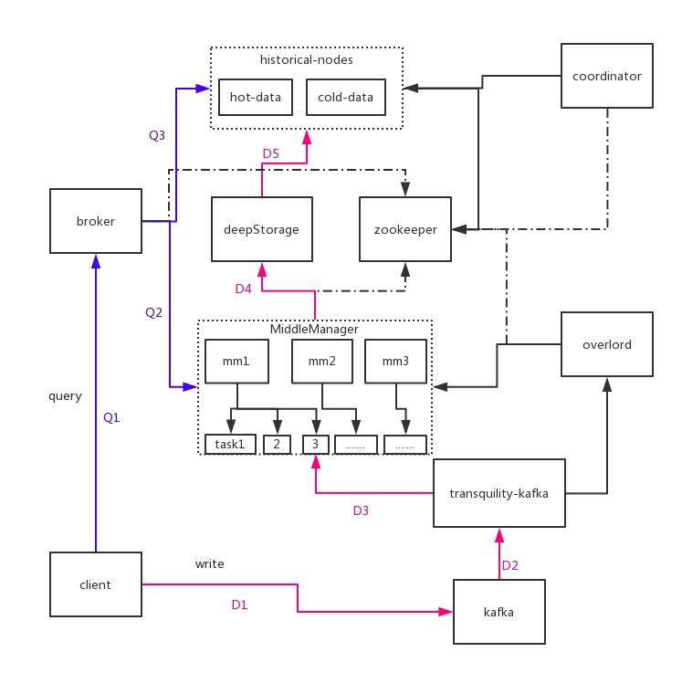 见上图红色箭头,D1是client生产数据最终写入kafka(这个过程可能在client与kafka的中间,还包含了多个环节,如数据传输与数据清洗),D2和D3过程是部署tranquility-kafka服务,消费kafka数据写入对应的task,tranquility-kakfa启动的时候会跟overlord节点通信,由overlord节点分配任务给middleManager执行。D4是task 负责的segment段正常结束,然后将segment数据写入deepstorage过程。(实时task运行时间是segmentGranularity+windowPeriod+intermediatePersistPeriod)。D5则是historical节点从deepstorage下载segment并在zk中声明负责该segment段查询的过程。
