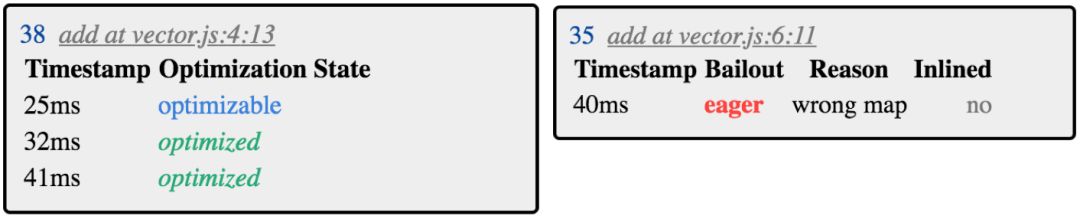 我们看到 add 在 32ms 后得到了优化。在大约 40ms 时,它被提供了一个输入类型,优化后的代码没有考虑到这个类型——因此出现了错误的映射——并且在这个时候被降级为 Ignition 字节码,同时收集更多的内联缓存信息,并在 41 毫秒后很快又进行了优化。
