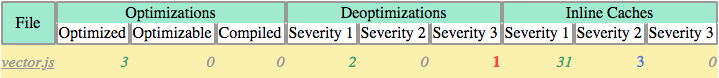 deoptigate 为我们提供了所有文件的摘要,在我们的示例中就是 vector.js。对于每个文件,它显示相关的优化、反优化和内联缓存信息。这里绿色表示没有问题,蓝色是次要问题,红色是潜在的重要问题,应该调查。只需单击文件的名称,就可以展开文件的细节。