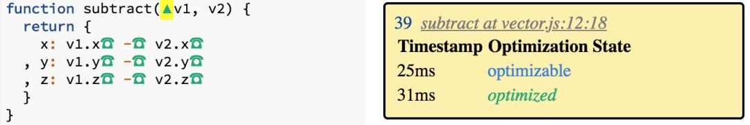 快速浏览一下,我们可以看到,subtract 显示不存在潜在的问题,但是 add 是存在的。单击代码中的红色三角形将突出显示右边的相关反优化信息。请注意,对于使用 Map 错误的原因。