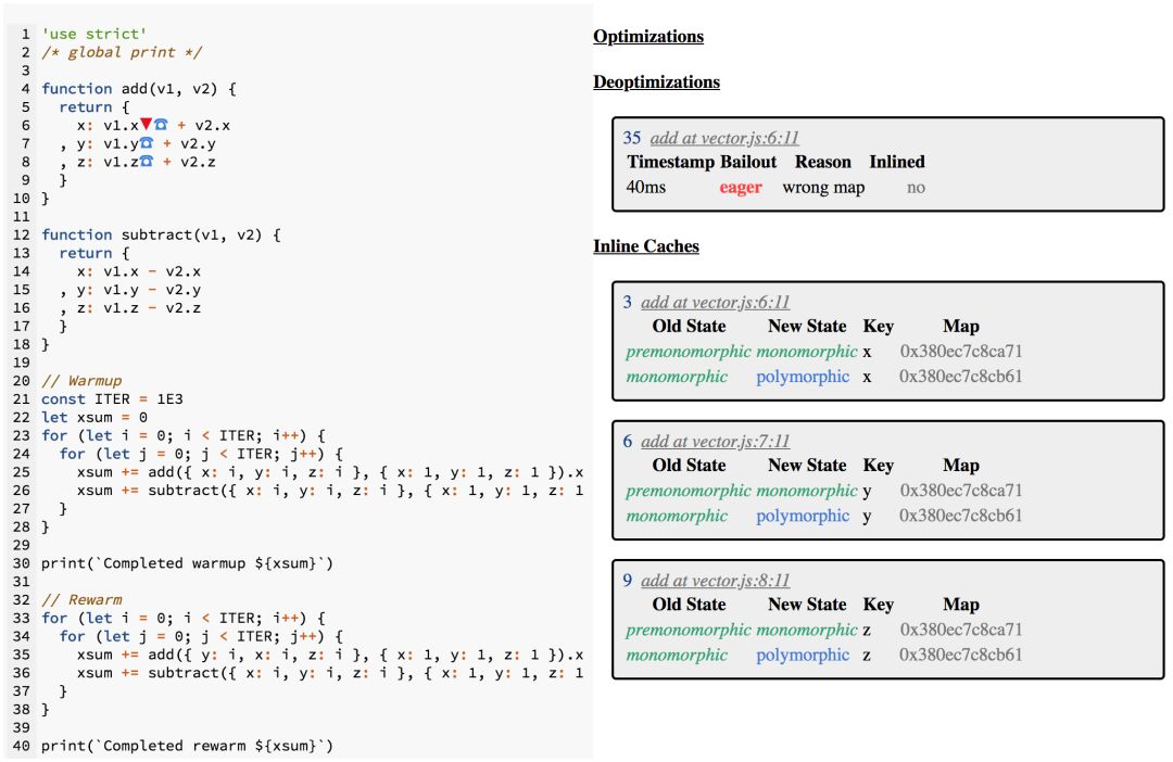 为了更方便地实现这一点,我创建了 deoptigate 项目,这个项目的目的是为你的函数提供优化、反优化和处理函数的单态 / 多态 / 变态特性。