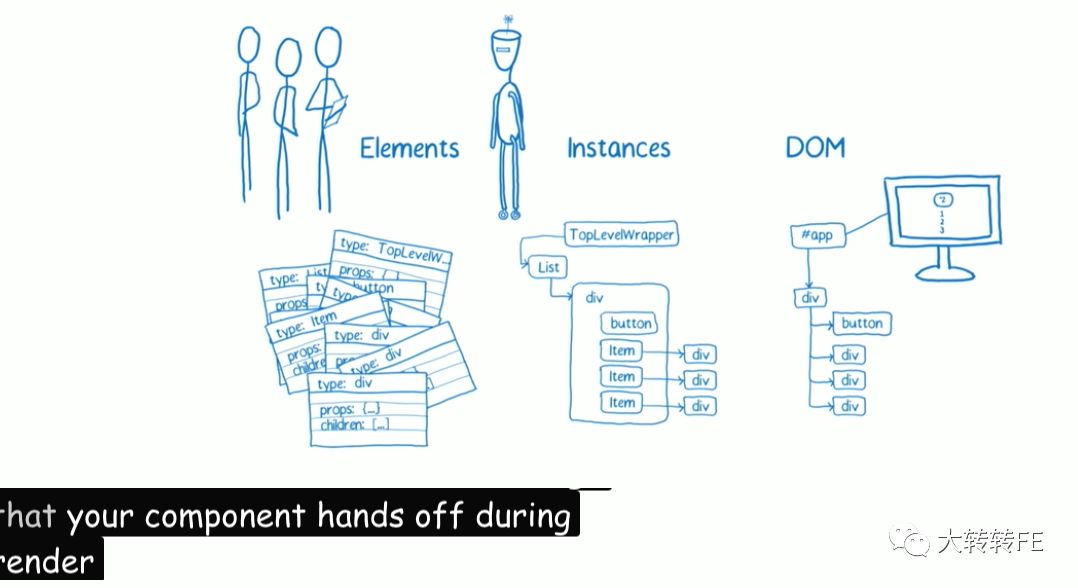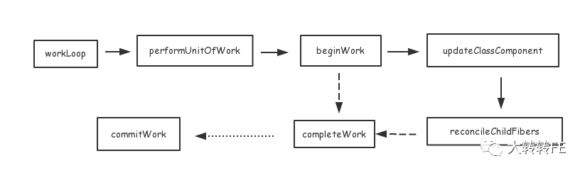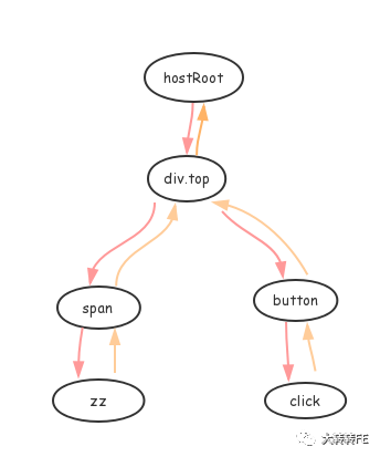 1.从根节点 #hostRoot出发,走到它的child节点 div.top2.div.top有两个子节点span和button ,先从左子树span开始3.span只有一个子节点 ZZ,到达树的底部后原路返回4.返回到span时发现其有一个兄弟节点 button, 走去button5.button有一个子节点 click, 同样到达树的底部后原路返回到button6.button的右边没有兄弟了(若有,则继续重复4-5),返回到父节点 div.top7.最后回到根节点 #hostRoot