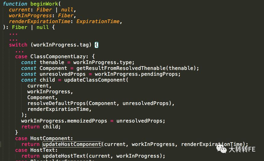 beginWork中只是处理节点的不同tag属性对应不同的更新方法。如 updateClassComponent方法对应的是tag类型是React组件实例。