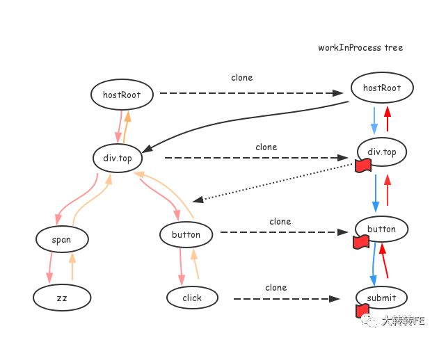 1.先把根节点 #hostRoot克隆出来,并用child属性指向它在fiber tree中的子节点div.top2.把div.top从fiber tree中克隆出来,需要更新的话,加一个tag标志3.更新div.top节点的状态,属性的指向等,并通过render获取到它的新子节点4.尽量复用旧子节点span或button来创建新子节点的workInProgress结构5.把新节点button做为下一个任务,调用requestIdleCallback获取当前帧所剩余的时间,如果还足够,就继续button的任务,重复2-4,否则,就等主线程空闲后再开始循环6.当子节点submit中没有child属性的指向,表示已到达底部。会把diff时产生的effect list会merge回return属性指向的父节点button上7.当父节点button没有兄弟节点时,会一直向上return回根节点,并把每个节点上产生的effect-list合并到根节点上。任务循环结束