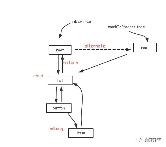 alternate在调用render或setState后,会克隆出一个镜像fiber,diff产生出的变化会标记在镜像fiber上。而alternate就是链接当前fiber tree和镜像fiber tree, 用于断点恢复。