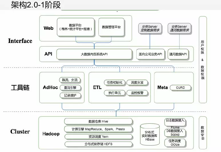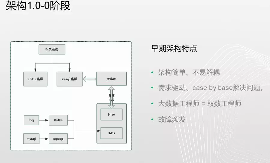 架构1.0阶段,底层是Hadoop,用来存储数据和分析数据。需要把log数据和事务数据传输到Hadoop平台上,我们使用的是kafka和sqoop进行数据传输。然后在Hadoop平台基础上,通过一个开源的Hive和oozie做一个调度,开发者写Hql来完成业务需求,然后将数据mysql集群或redis集群,上层承接的是一个报表系统。这个需求基本跑了一年,也解决了一些问题。但存在的问题有:(1)架构简单,不易解耦,结合太紧密出现问题需要从底层一直查到上面;(2)平台架构是需求驱动,面临一个需求后需要两周时间来解决问题,有时开发出来运营已经不需要;(3)将大数据工程师做成一个取数工程师,大量时间在获取怎样数据;(4)故障频发,比如Hql跑失败了或者网络延迟没成功,oozie是通过xml配置发布任务,我们解决需要从数据仓库最底层跑到数据仓库最高层,还要重刷msl,花费时间。
