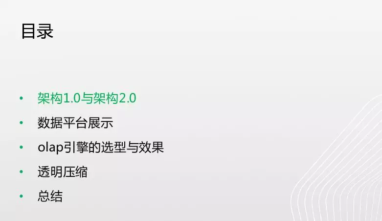 大数据平台构建方法大同小异,但是平台构建以后也面临很多挑战,在面临这些挑战我们如何去克服、修复它,让平台更好满足用户需求,这就是本次主题的重点。下面是本次分享的内容章节,首先讲一下架构1.0与2.0,两者分别是怎么样的,从1.0到2.0遇到了哪些问题;第二部分讲一下数据平台,都有哪些数据平台,这些数据平台都解决什么问题;第三个介绍下当前比较重要的项目“olap引擎的选型与效果”以及遇到的一些问题;第四个简单讲一下在透明压缩方面的研究。