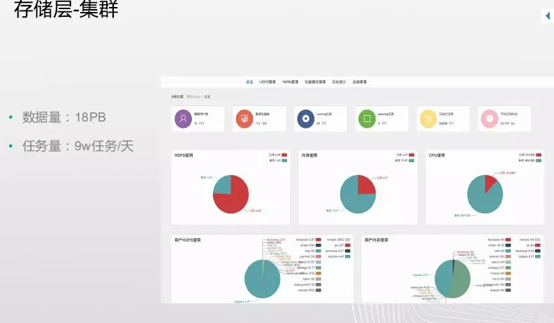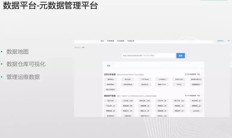 第二部分就简单介绍下平台,第一个是存储层-集群层,解决运维工作,我们基于开源做了一个presto。实习人员经过一两周能适应这个工作,释放了运维的压力,数据量目前有18PB,每天的任务有9万+,平均3-4任务/分钟;第二个就是元数据管理平台,这种表抽象为各个层,分析数据、基础细节数据等抽象,提供一个类似百度的搜索框,通过搜索获得所需数据,这样业务人员能够非常方便的使用我们的数据。它能实现数据地图(数据长怎样,关联关系是怎么样都可以显示出来),数据仓库可视化,管理运维数据,数据资产非常好的管理和运维,将数据开发的工作便捷化、简易化。