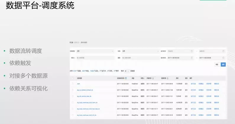 第三个数据平台调度系统,数据仓库中的各个层需要流转,数据出现问题后如何去恢复数据。数据调度系统主要的工作有:(1)数据流转调度,可以非常简易的配置出数据的流转调度。(2)依赖触发,充分利用资源,能够让调度任务非常紧凑,能够尽可能快的产出我们的数据。(3)对接多个数据源,需要将多种多样的数据源集成到数据仓库中,如何将sql server数据、Oracle数据等数据导入到数据仓库中,系统能够对接多种数据源,因此我们财务人员、运营人员、业务人员都可以自主将数据接入到数据仓库,然后分析和调度。(4)依赖关系可视化。比如我们有100个任务是关联的,最底层std层有50个任务,中间层有20个任务,如果中间ODS层出问题了,会影响上层依赖层任务,通过可视化就能很方便定位。