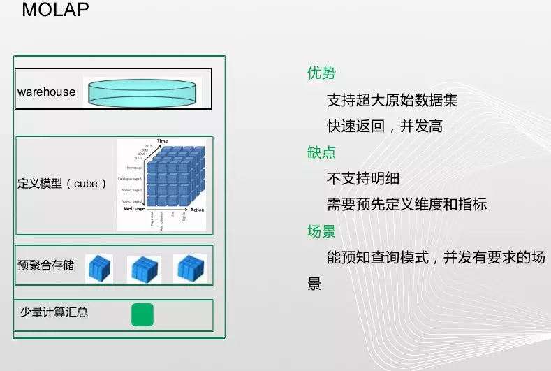 Molap中间会有一个中心立方体cube,在数据仓库通过预计算将数据存储到cube中,通过预聚合存储支持少量计算汇总,为什么少量计算,因为数据都已经预计算好了。优点就是支持超大数据集,快速返回并发高,缺点是不支持明细,需要预先定义维度和指标,适用场景就是能预知查询模式,并发有要求的场景,固化场景可以使用molap。
