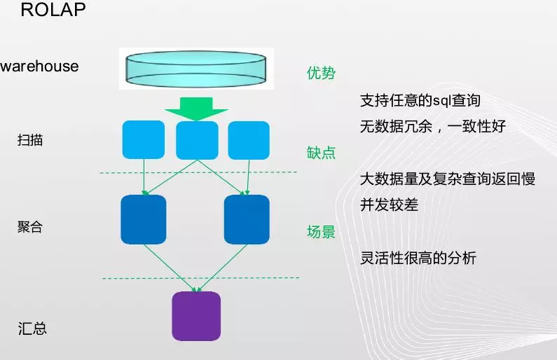 Rolap查询时首先将数据扫描出来,然后进行聚合,通过聚合结果将多个节点数据整合到一个节点上然后返回。优势是支持任何sql查询,因为数据是硬算,使用明细数据,没有数据冗余,一致性非常好,缺点是大数据量或复杂数据量返回慢,因为你是基于明细数据,一条一条数据计算无论如何优化还是会出现瓶颈,并发性很差。