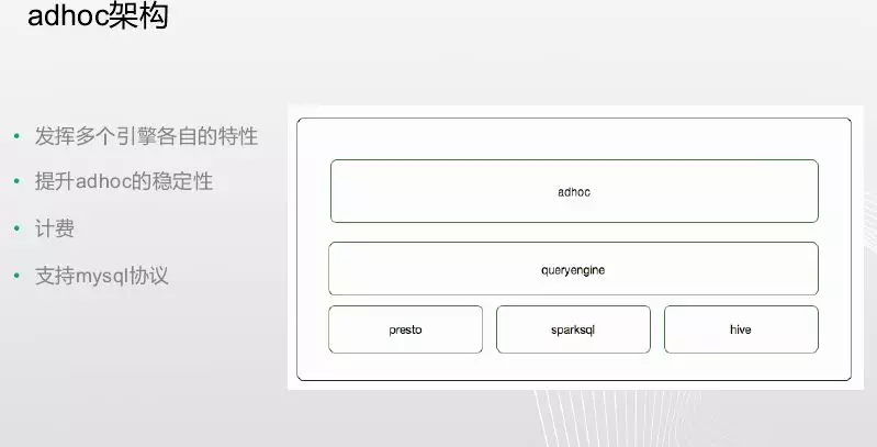 我们是需求驱动,每天都会遇到很多需求,数据开发人员就是取出需要的数据。利用adhoc平台将数据从数据仓库中取出,基于这个我们做了一个智能搜索引擎,架构在adhoc上的搜索引擎有很多,比如presto、hive、spark等。用户也不知道该选择那种引擎,他的需求就是尽可能取出自己所需的数据,因此开发智能选择引擎、权限控制,并且能够支撑各种接口、自助查询,这样就基本解决了数据开发的工作。我们自研发了一个queryengine,在底层有presto、sparksql、hive等,queryengine特点就是能够发挥各自引擎的特性,如presto查询快,但是sql支撑能力不强,sparksql同样,在某些特殊sql查询不如hive快,hive就是稳但是慢。queryengine就是智能选择各种引擎,用户把sql提交过来,queryengine判断哪个引擎适合你。如何做的简单介绍下,对sql进行解析成使用的函数、使用的表、需要返回的字段结构,根据各个引擎的能力判断哪个合适。目前还在开发功能就是计费,因为资源是有限的。queryengine支持mysql协议,因为有些用户需要BI能力,需要对返回的数据进行聚合,我们不能开各种各样的BI能力,我们只需满足mysql协议将数据暴露出去,用户只需用其他BI就能使用。