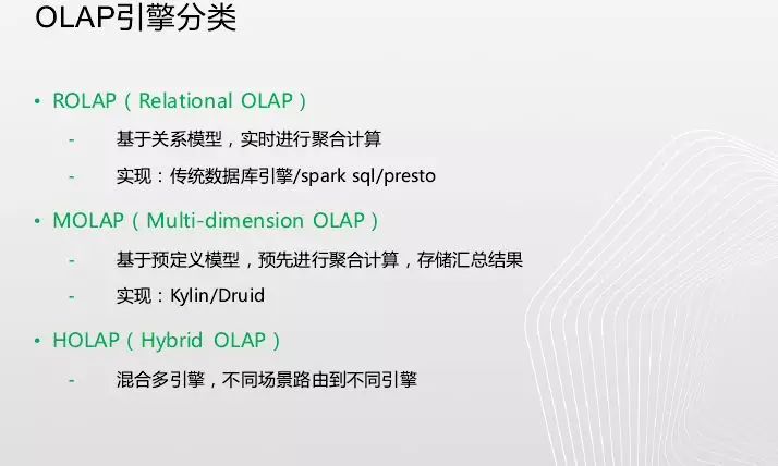 通过架构1.0到架构2.0衍生出很多平台,大架构已经有了,但是遇到的一些问题如何解决。这里分享两个案例,一个是olap引擎的选型与效果,第二个就是为什么要做透明压缩,是如何做的。Rolap引擎基本是基于关系型数据库,基于关系模型实时进行聚合运算,主要通过传统数据库或spqrk sql和presto,spqrk sql和presto是根据数据实时计算;Molap是基于一个预定义模型,预先进行聚合计算,存储汇总结果。先计算好一个立方体,基于立方体做上传下钻,实现由Kylin/Druid,Druid主要是实时接入(Kylin没有),实时将kafka数据用Spark sql做一次计算然后将数据上传上去,可以支持秒级查询;还有一个比较流行的是叫olap,混合多引擎,不同场景路由到不同引擎。