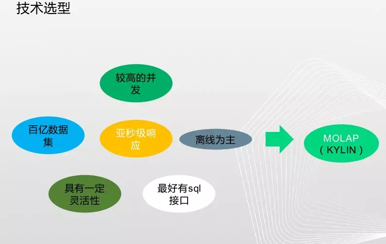 对于技术选型,当时面临的需求,基本上开源组件有很多,为什么选择kylin,因为支持较高的并发,面对百亿级数据能够支持亚秒级查询,以离线为主,具有一定的灵活性,最好有sql接口,而这些需求刚好kylin能满足。Apache Kylin™是一个开源的分布式分析引擎,提供Hadoop之上的SQL查询接口及多维分析能力,以支持超大规模数据,最初由e Bay Inc. 开发并贡献至开源社区。它能在亚秒内查询巨大的Hive表。其解决方案就是预先定义维度和指标,预计算cube,存储到hbase中,查询时解析sql路由到hbase中获取结果。