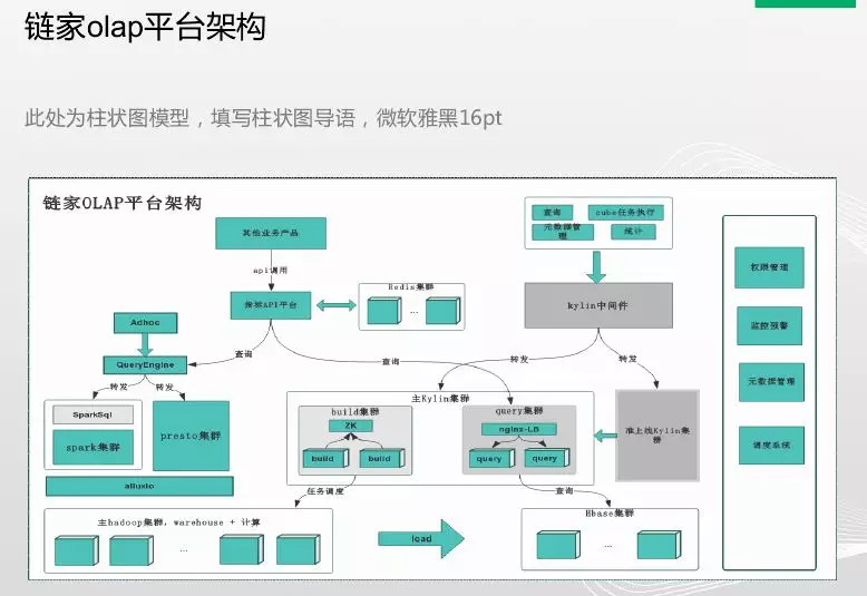 现在讲一下链家olap架构,HBase集群,数据仓库计算和预处理在这块,还有一个为了满足kylin需求而做的HBase集群。Kylin需要做预计算,因此有个build集群,将数据写入到基于kylin的Hadoop集群中,然后利用nginx做一个负载均衡,还有一个query集群,然后就是面向线上的一个查询,还有一个kylin中间件,解决查询、cube任务执行、数据管理、统计。指标平台大部分是查询kylin,但是kylin不能满足明细查询,这个就通过queryengine智能匹配,通过spark集群或presto集群,还有alluxio做压缩,然后将明细查询结果返回指标平台,最终返回其他业务的产品。在横向还做了一个权限管理、监控预警、元数据管理、调度系统,来实现整体平台支撑。