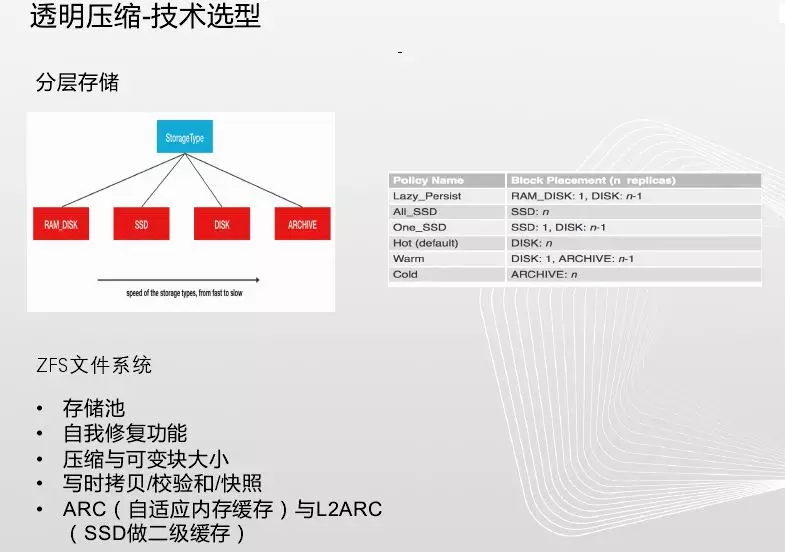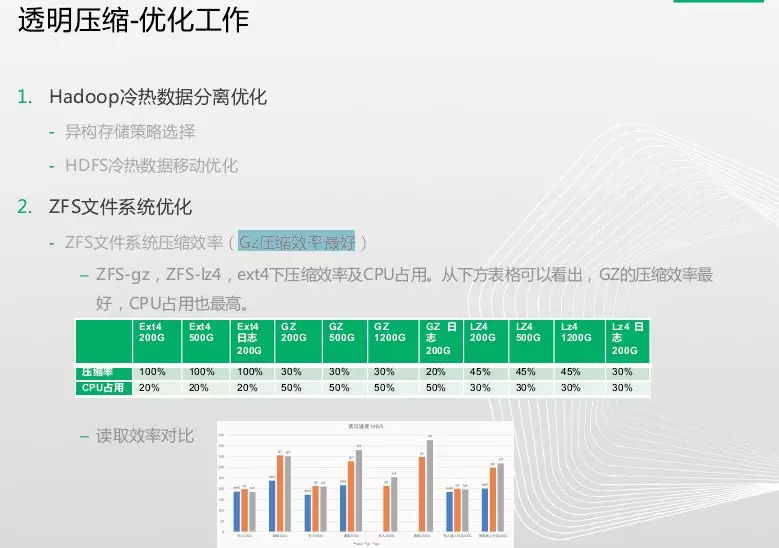透明压缩优化工作有:第一个Hadoop冷热数据分离优化。涉及有异构存储策略选择、HDFS冷热数据移动优化;第二个就是ZFS文件系统优化。ZFS支持很多压缩算法,经过测试发现Gz压缩效率最好,下图是各种算法效率对比。随着压缩数据越来越大,CPU占用越来越高。海量数据集群不光是存储还有计算。Datanode对压缩数据的加载时间,直接关系到访问此部分数据时的效率,从表可知,ZFS的gz压缩在datanode加载数据上对LZ4有部分优势。较为接近EXT4。综合考虑压缩率,读取,写入速度,datanode加载速度等,选定gz作为ZFS文件系统的压缩算法。
