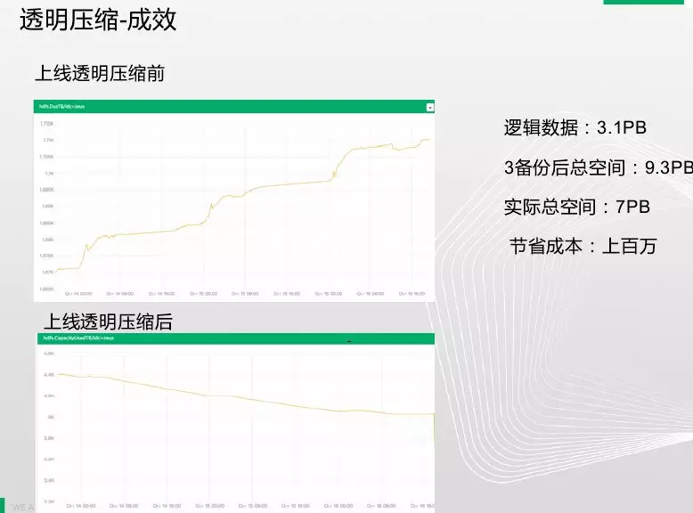 透明压缩前数据增长是非常快的,接近30%的增长速率,逻辑数据有3PB,3备份后总空间:9.3PB实际总空间:7PB,就目前简单预估节省成本有300万。压缩后虽然实际数据再增长,但真实数据是缓慢下降的。