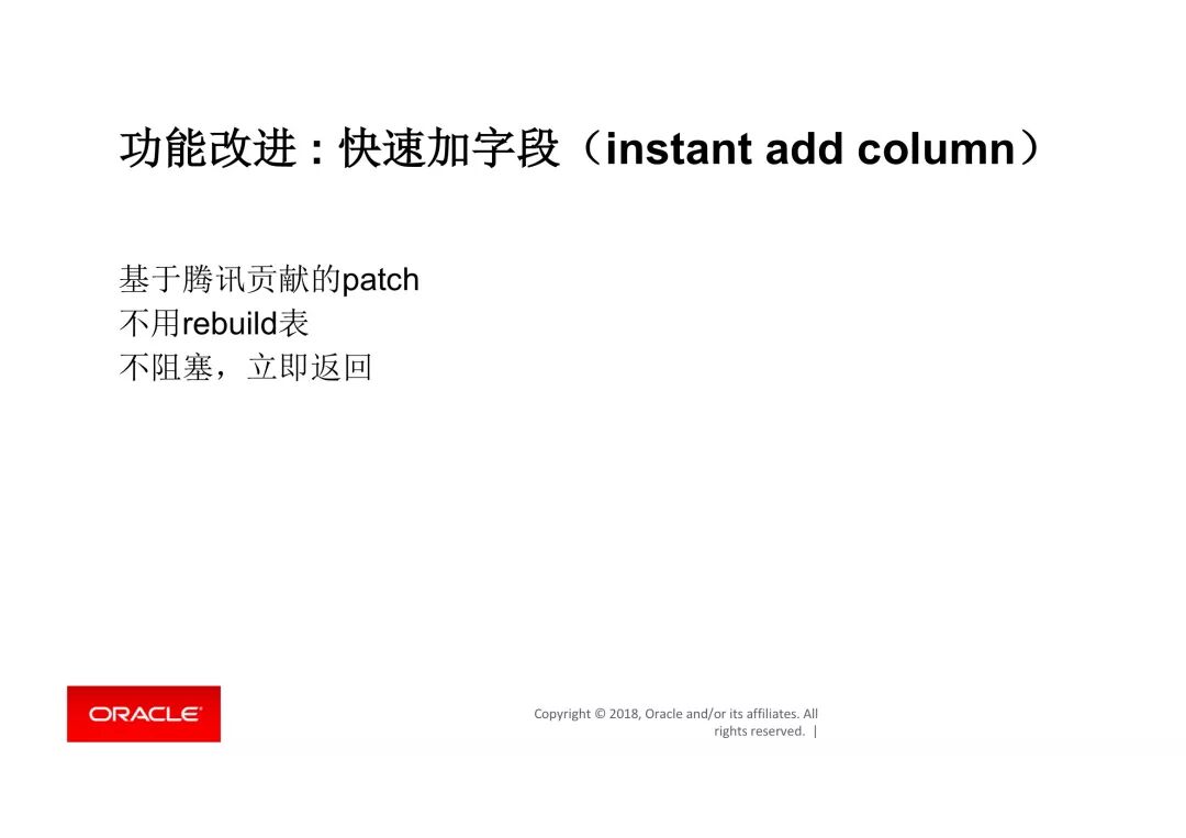 发一个加字段指令,瞬间返回,为了能够做到这个,我们改了页结构,改了数据的页结构,能够告诉我们,你当前加过字段记录,还是没有加过字段记录,我们针对两个不同版本有不同的处理方式,这是这个功能达到的目的,这个非常实用,大家将来用8.0会经常用到这个功能。