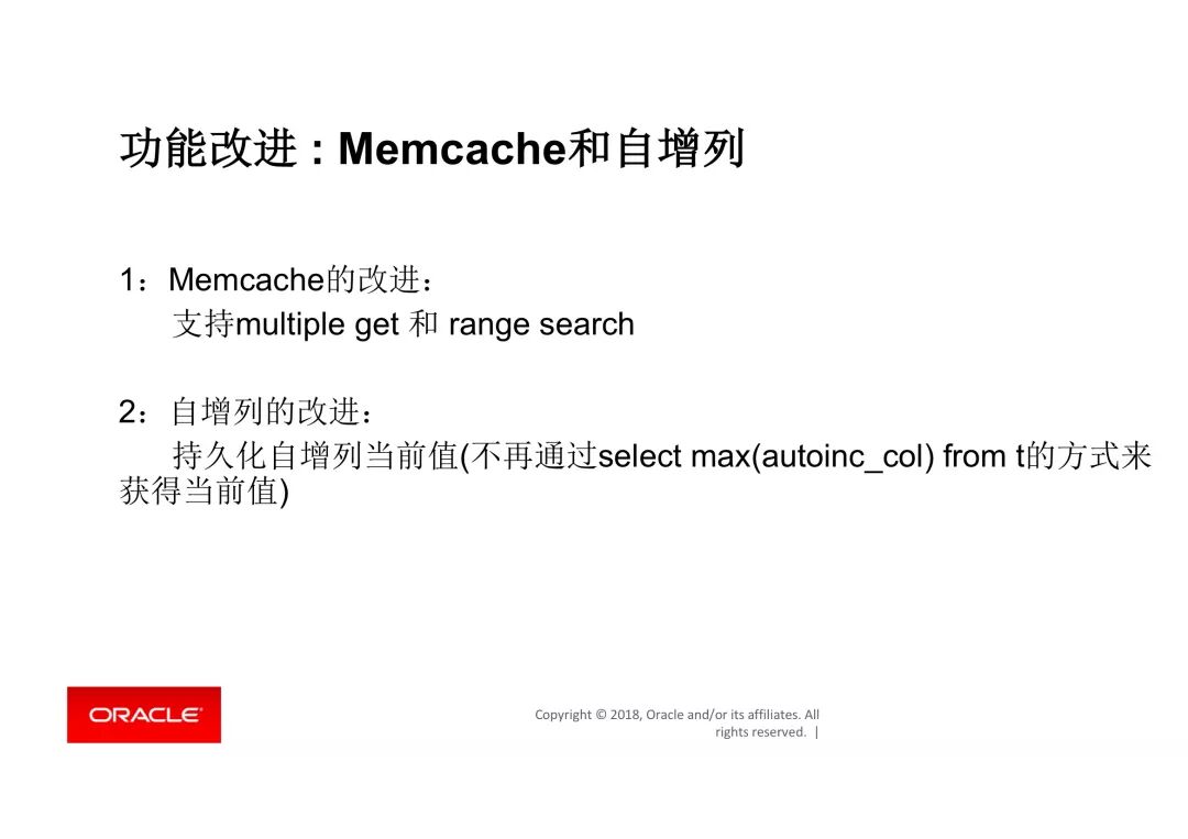 接下来一个功能,Memcached和自增列的改进,大家了解Memcached,它是一个缓存系统,InnoDB的Memcached plugin,可能大家不是特别熟悉,我了解下来可能大家用这个功能比较少。