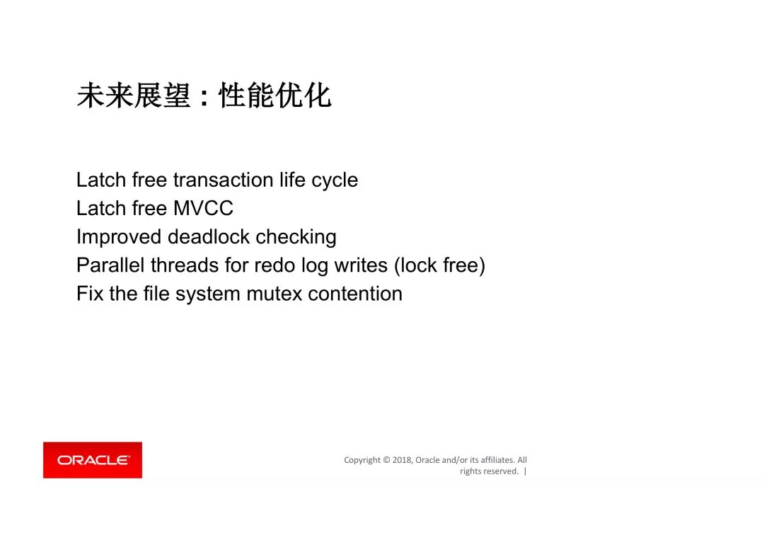 将来还有这样的性能优化,对于事物生命周期优化,不必要的去掉,MVCC可能进行一些改进,死锁检测也会进行一些改进。还有文件系统的变化,做冲突的保护。