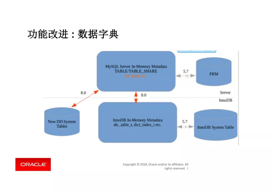 第一部分,功能的改进,功能改进第一个最大的改动,在8.0里面,我们在InnoDB把数据字典进行重构,大家应该知道数据字典是什么,就是表结构,你的用户定义,所有的跟DDL相关放到数据字典里面去。