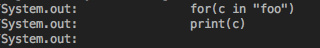 9、when语法(和java中的switch case default 类似) kotlin代码 fun faceScoreDescn(score:Int):String{ var descn:String; when(score){ 10 -> descn = "令人惊艳的帅(美)" 9 -> descn = "令人着迷的帅(美)" 8 -> descn = "帅哥(美女)" 7 -> descn = "有点帅(漂亮)" 6 -> descn = "中等水平" else -> descn = "其貌不扬" } return descn } java代码 public String faceScoreDescn(int score){ String descn=null; switch(){ case 10: descn = "令人惊艳的帅(美)"; break; case 9: .....