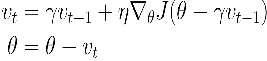 在动量法中,小球下滚过程如果遇到上坡则会减小速度,那么更好的做法应该是遇到上坡之前就减慢速度。这就是 NAG 的大致思想,相较于动量法,NAG在计算参数的梯度时,在损失函数中减去了动量项,这种方式相当于预估了下一次参数所在的位置。公式如下: