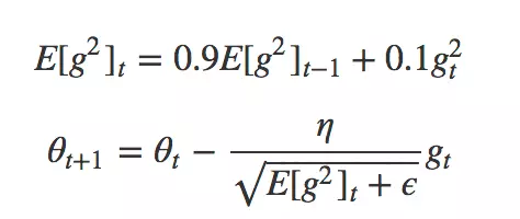 RMSprop 是 AdaDelta 的一个特例,它由 Geoff Hinton 在公开课中提出,采用梯度平方的指数移动平均数来调整,当参数更新较大时会对它进行「惩罚」,它的公式如下: