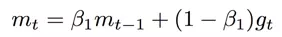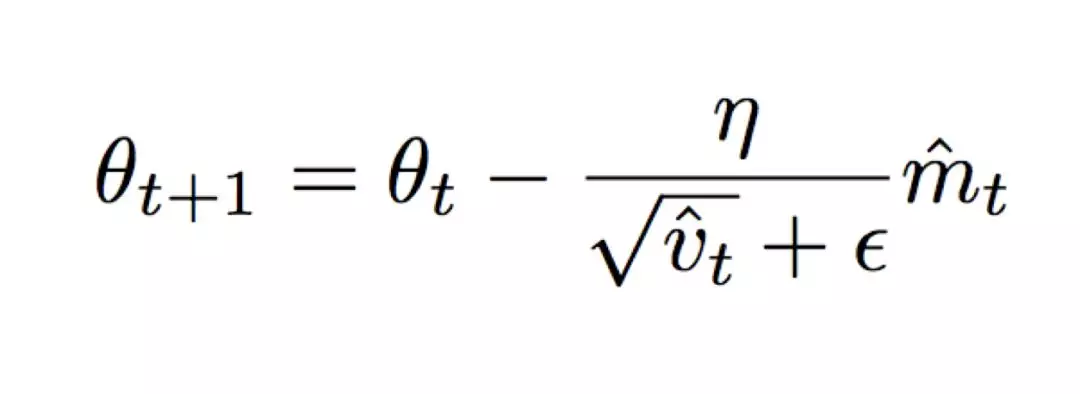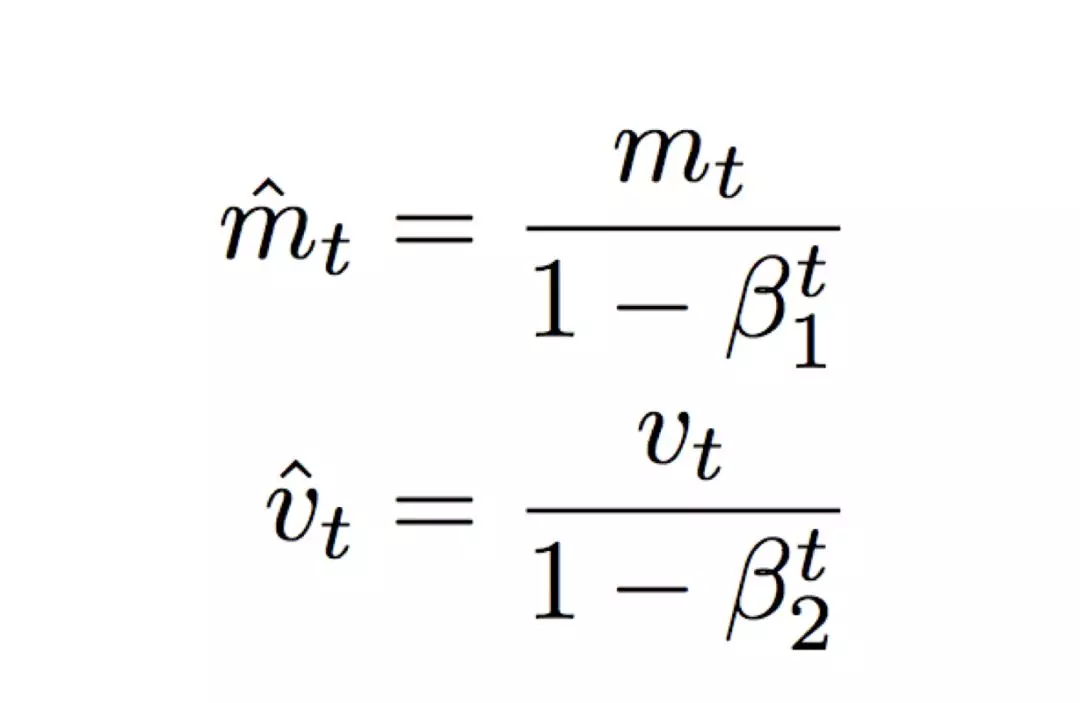 则是梯度平方的指数移动平均数,也就是 RMSProp 的过程。由于基于指数移动平均数的方式存在偏差,特别是在下降初期 m 和 v 被初始化为0并且接近 1 时。为此,引入偏差修正过程:
