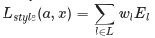 其中 Gˡᵢⱼ 和 Aˡᵢⱼ 分别为输入图像 x 和风格图像 a 在 l 层的风格表征。Nl 表示特征图的数量,每个图的大小为 Ml= 高度 ∗ 宽度。因此,每层的总风格损失为