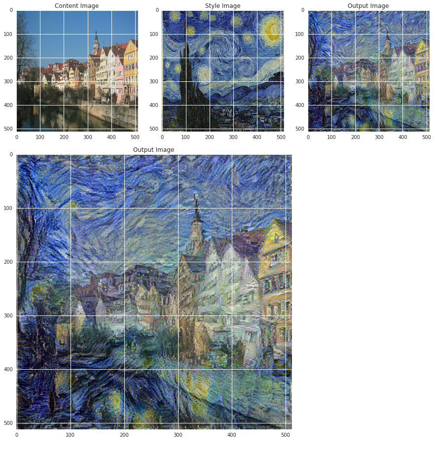 简而言之,我们会选取基本输入图像、我们想要匹配的内容图像以及想要匹配的风格图像。我们将使用反向传播算法最小化内容和风格距离(损失),以转换基本输入图像,创建与内容图像的内容和风格图像的风格相匹配的图像。
