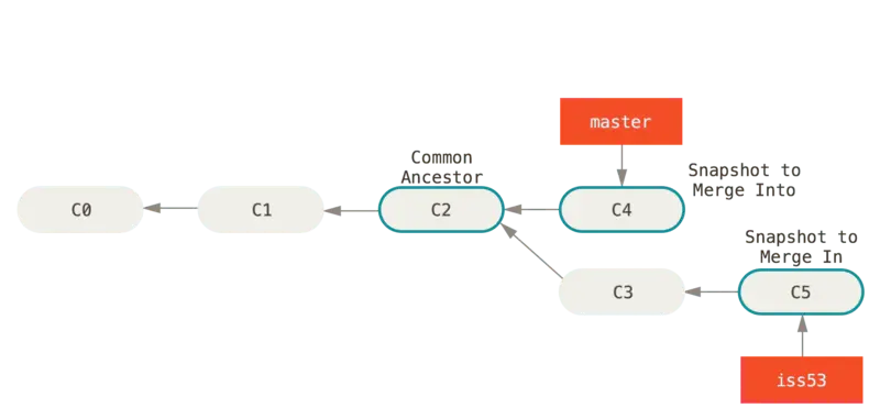 此时,你的开发历史从一个更早的地方开始分叉开来(diverged)。 因为,master 分支所在提交并不是 iss53 分支所在提交的直接祖先,Git 不得不做一些额外的工作。 出现这种情况的时候,Git 会使用两个分支的末端所指的快照(C4 和 C5)以及这两个分支的工作祖先(C2),做一个简单的三方合并。