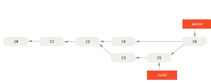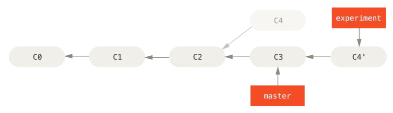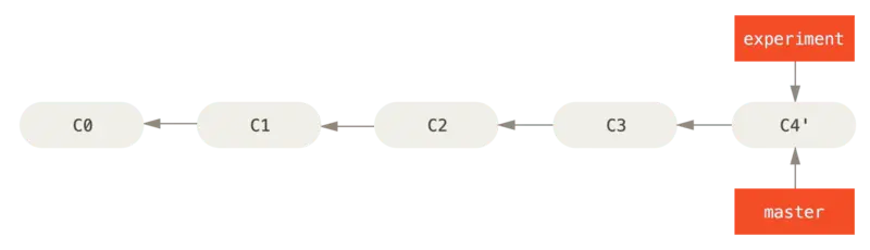 最后会生成一个新的合并提交对象(C4'),从而改写 experiment 的提交历史,使它成为 master 分支的直接下游