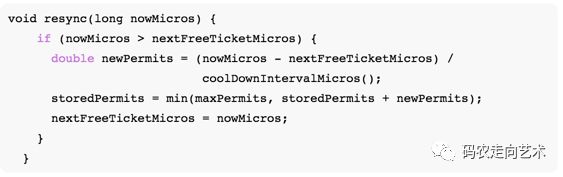首先调用resync(nowMicros),重置nextFreeTicketMicros。如果nowMicros在nextFreeTicketMicros之后,nextFreeTicketMicros=nowMicros,并往storedPermits中增加这段时间能产生的令牌。返回值设置为当前的nextFreeTicketMicros。为什么要这样设置呢?因为如果nowMicros大于nextFreeTicketMicros,说明令牌桶肯定能满足需求(无论请求的令牌数目是多少,参见最上面的设计哲学),而resync方法已经修改了nextFreeTicketMicros值为nowMicros值,逐层返回给调用者时,等待时间为0,线程无需等待;反之,如果nowMicros小于等于nextFreeTicketMicros,说明请求过快,线程需要等待,等待的时间就是nextFreeTicketMicros-nowMicros。